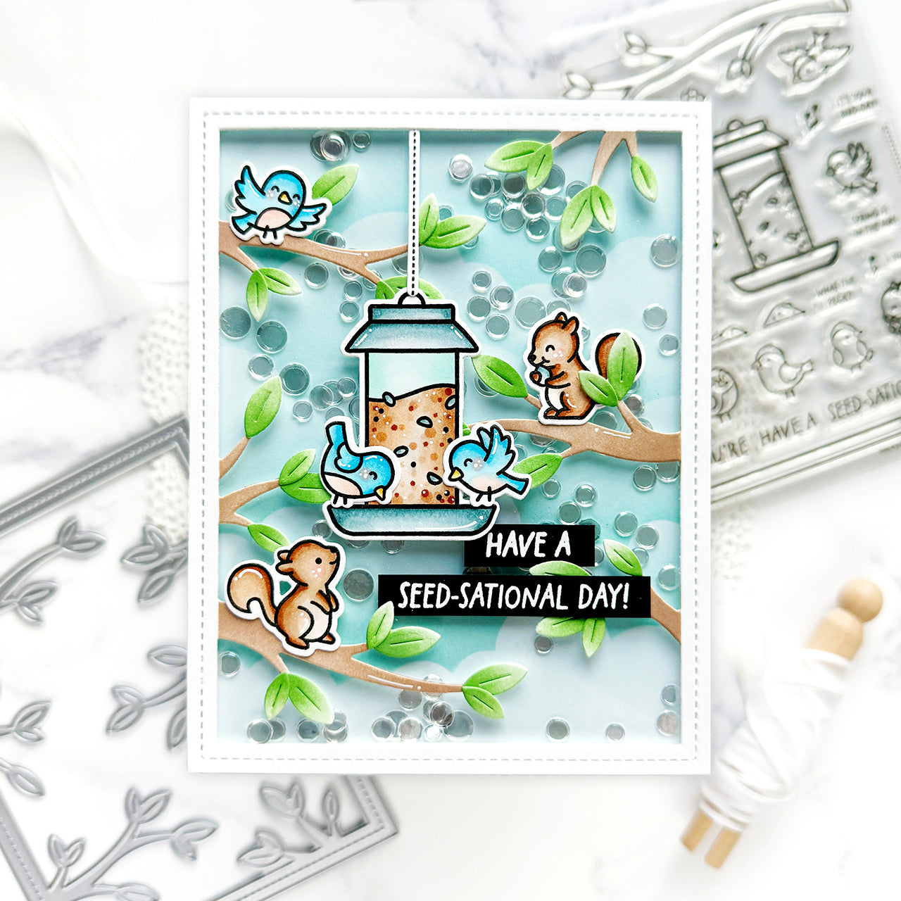 Hang a treat filled feeder on the included branch or post and watch critters gather around the backyard snack bar! Perfect for crafting springtime, friendship, birthdays, or just-because cards sure to bring a smile to your special person. For more feeders and super cute sentiments to complement your scene, check out Backyard Bird Feeder Add-On!