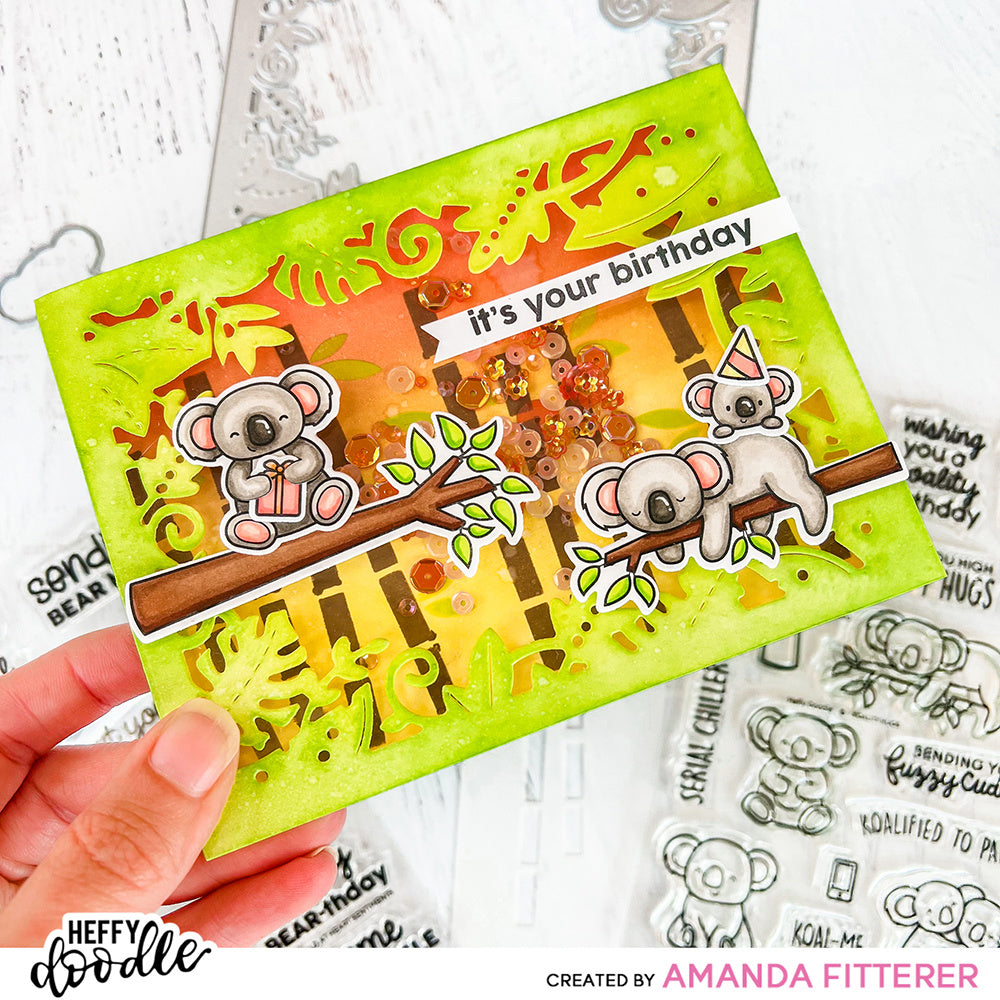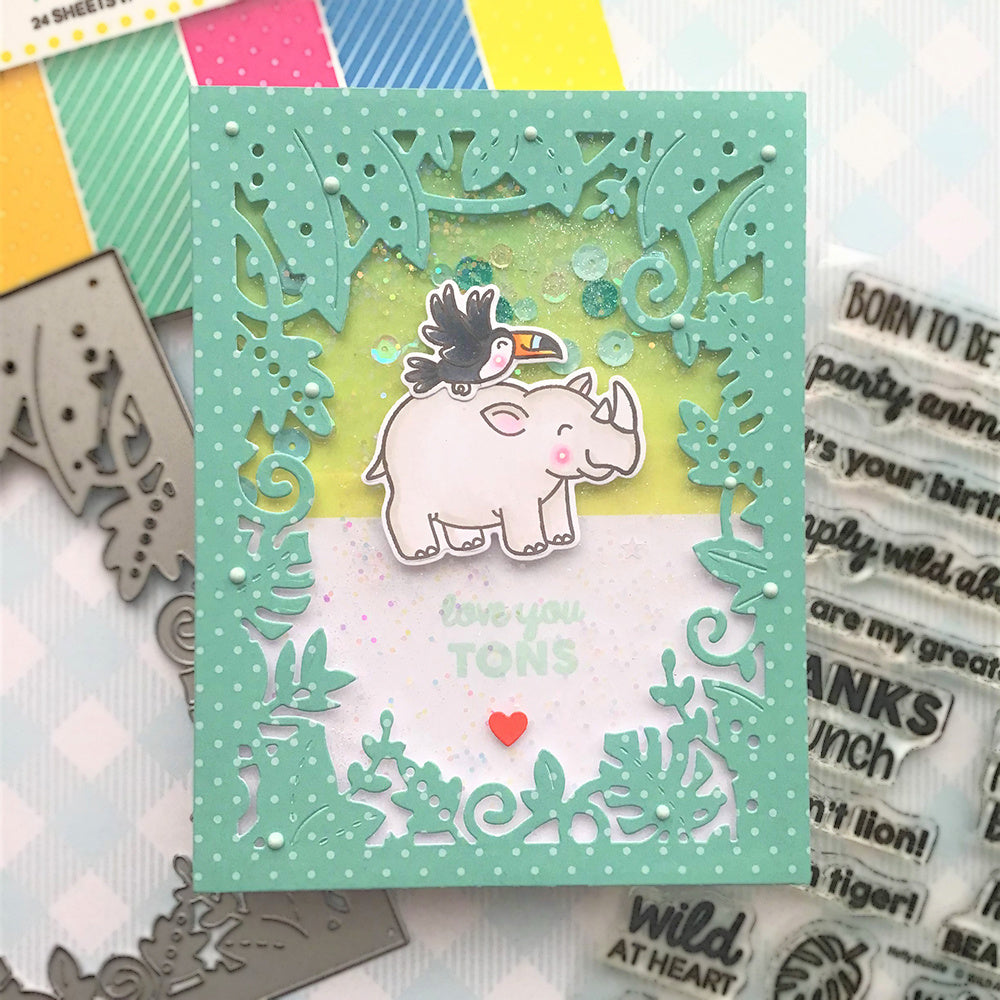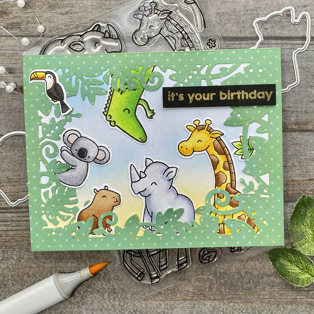 This set features a leafy frame die full of exotic leaves, which creates a fun aperture in the centre of your card perfect for some cute critters!
