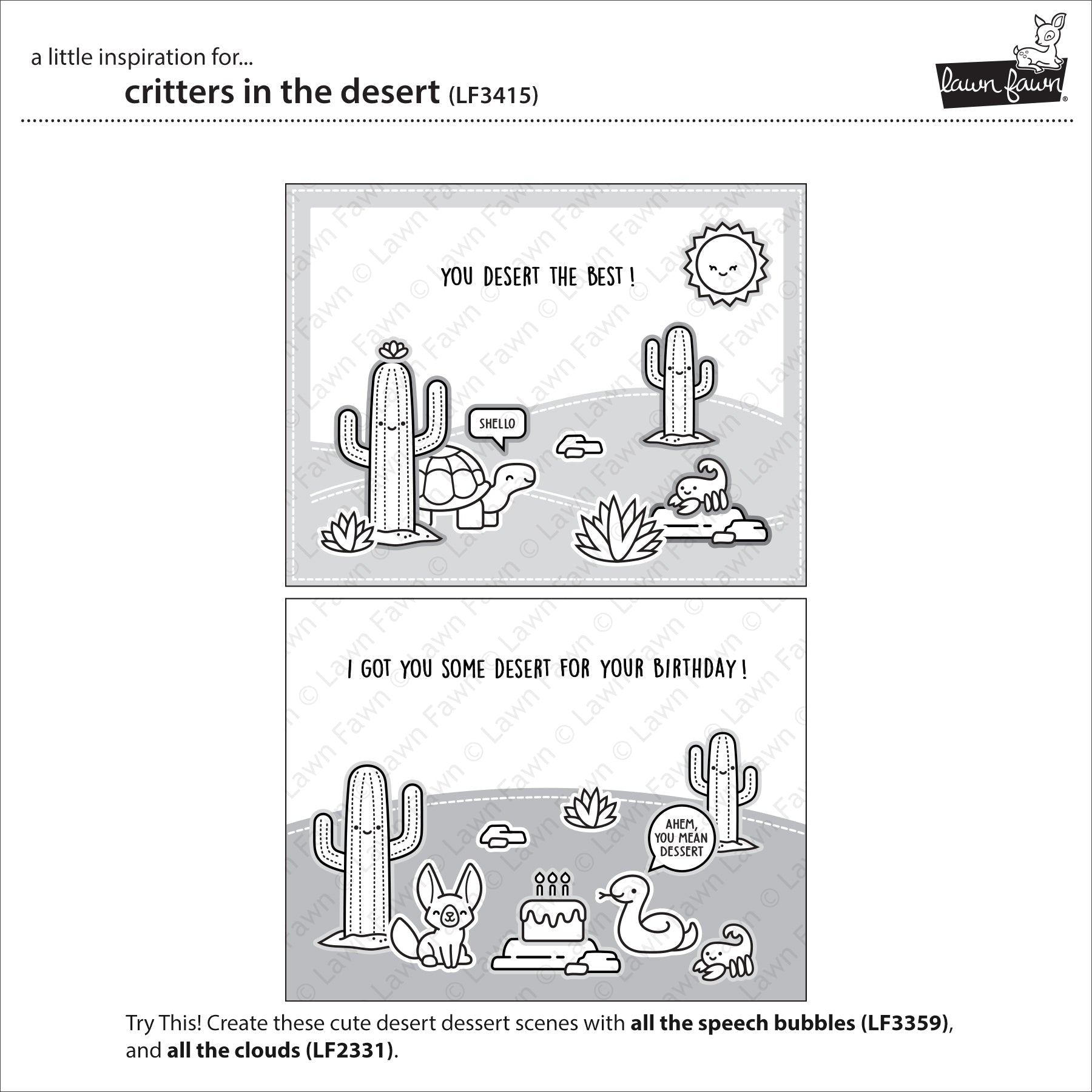 Coordinating set ideas: Adding Desert Canyon Backdrop creates a scene for your critters at road runner speed! Ink a beautiful desert sunrise and add a prickly border with Cactus Border or Cactus Hillside Border for another fun scene building combo! Add some adorable party hats to the critters and cacti with All the Party Hats. Looking for the perfect speech bubble for the included tiny sentiments? Check out All the Speech Bubbles and All the Speech Bubbles Lawn Cuts!
