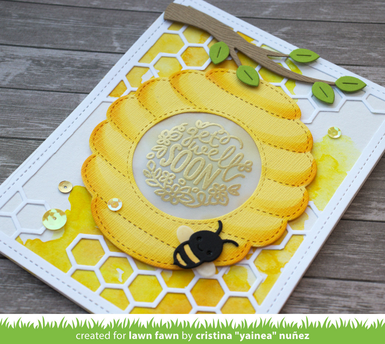 This stitched backdrop die will add lots of detail to all of your sweet-as-honey projects! Use different colors of cardstock to add fun patterns to the stitched honeycomb cells for a cool effect.