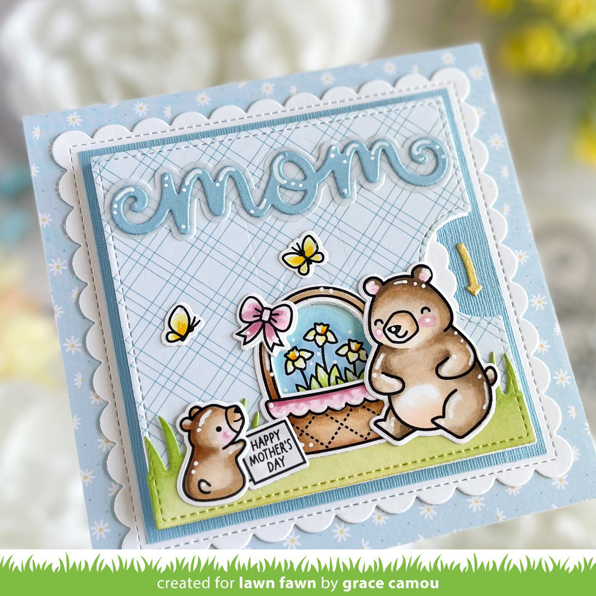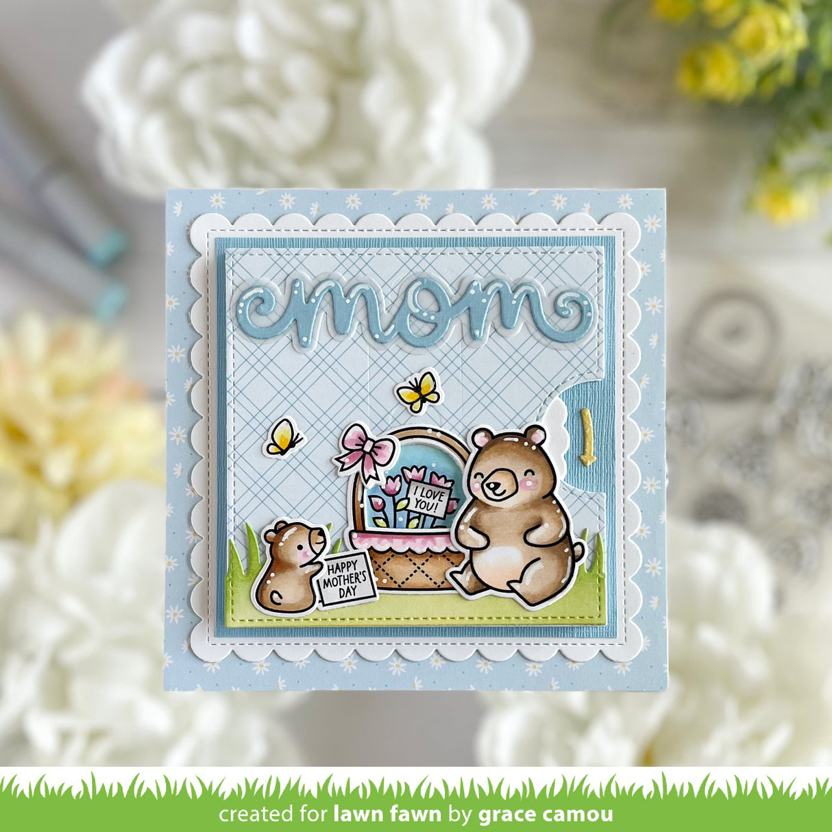 This set also contains a small template to help you place the die lower in your scene when cutting the window shape with Reveal Wheel. To make it even easier to stamp your images inside your basket window, use the optional Reveal Wheel Templates: Spring Basket Drop-Down.