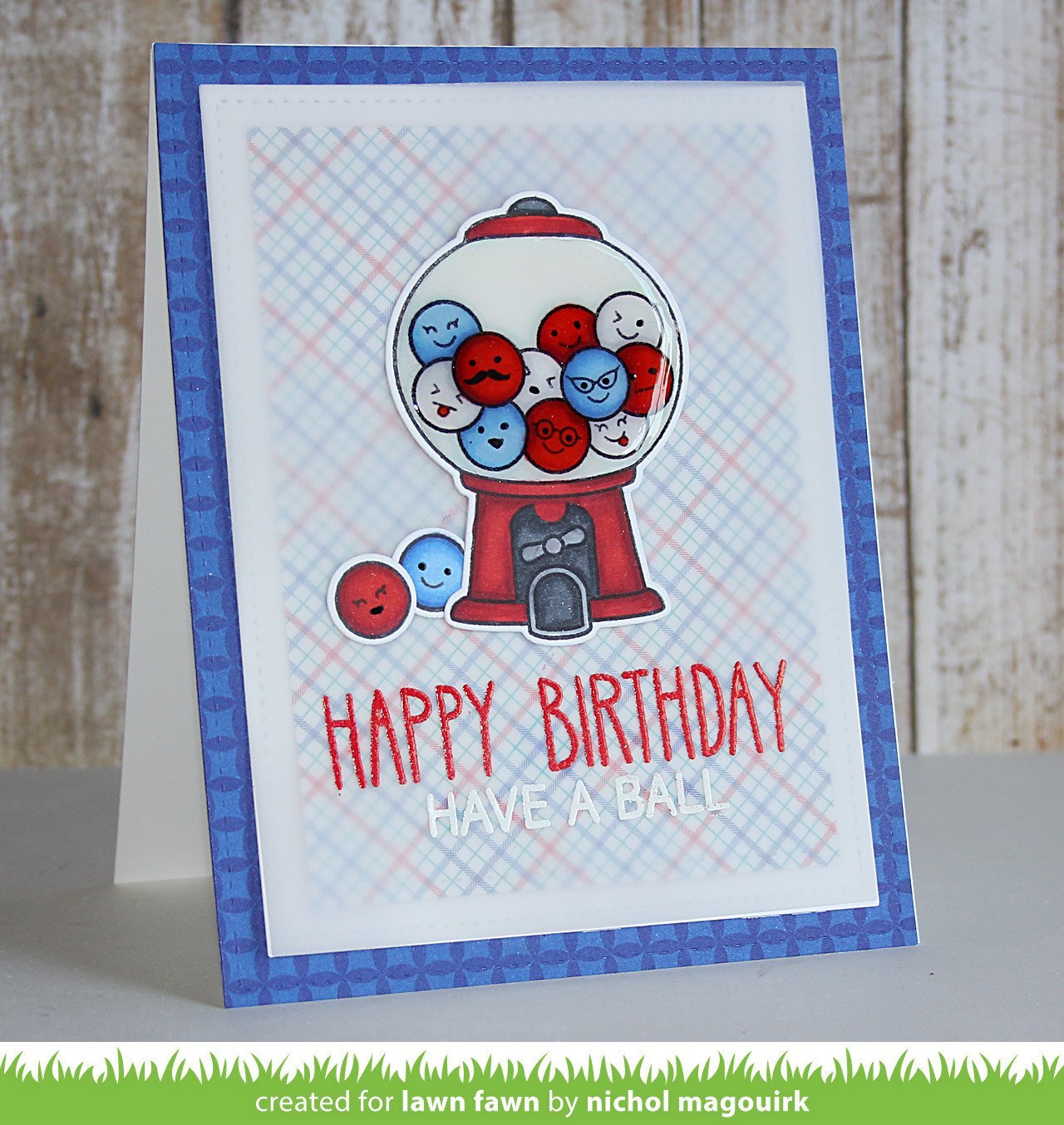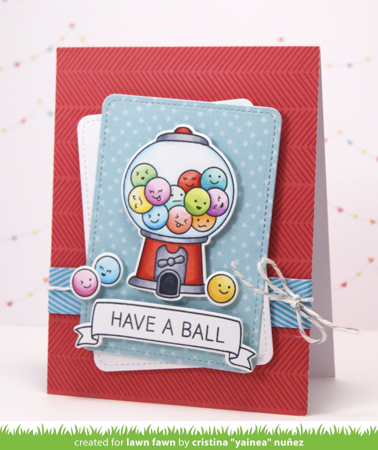 You'll have a ball with these 23 clear stamps! This set features a gumball machine, sentiments, and lots of smiley faces that will fit in the gumballs. The smiley faces will also coordinate with lots of other Lawn Fawn stamps, so you can stamp a smile onto your favorite image!