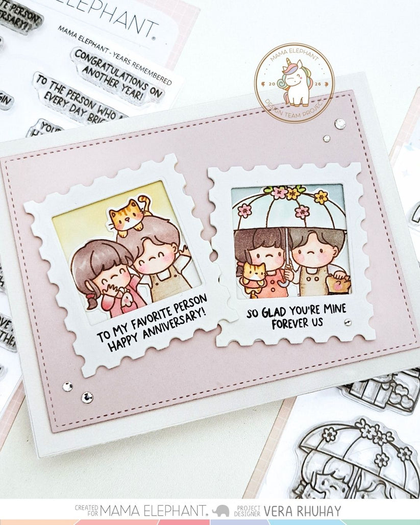 Anniversary Celebration clear stamp set brings the same playful charm as the Birthday Celebration set —this time celebrating love! Featuring a sweet boy and girl with their adorable pets, this set is perfect for anniversary cards and special celebration projects.