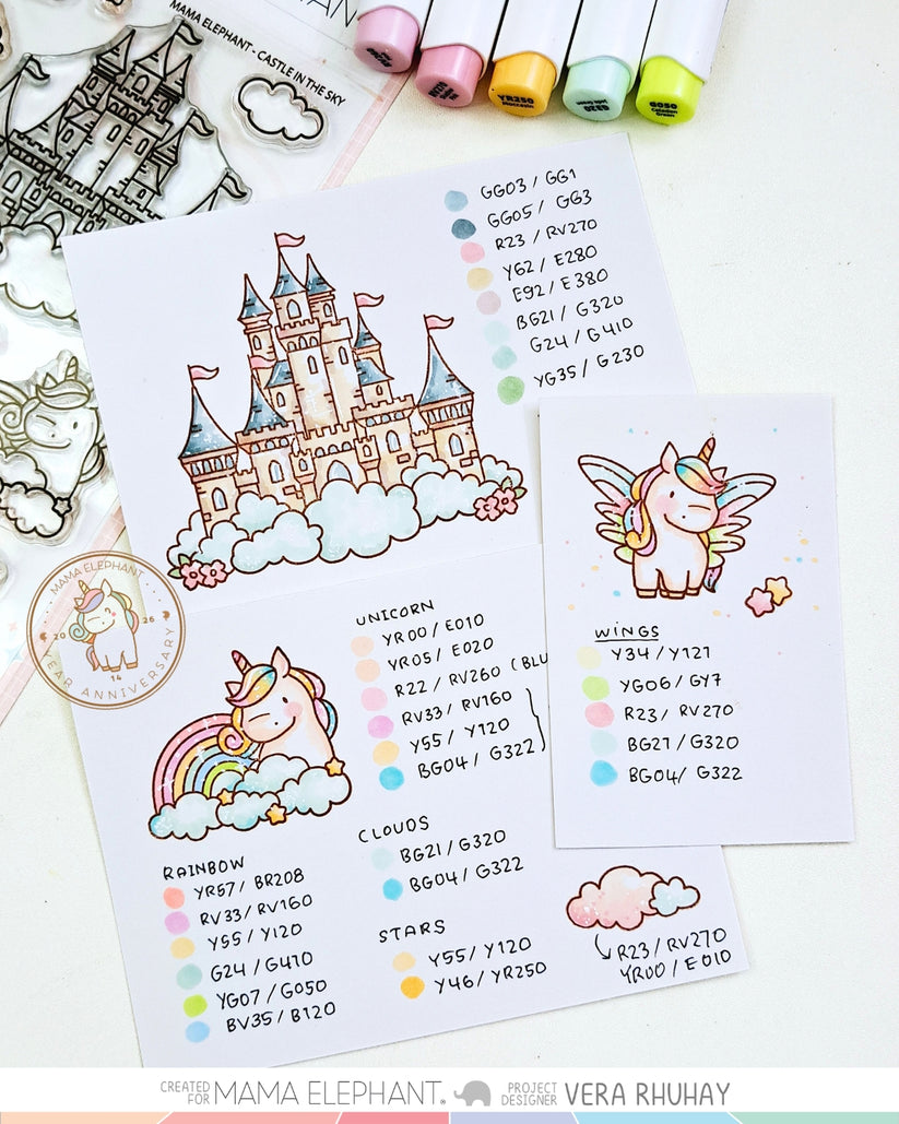 Let your creativity soar with the Castle In The Sky clear stamp set featuring unicorns, a grand storybook castle, and cheerful rainbows, this set is filled with elements to build magical scenes.