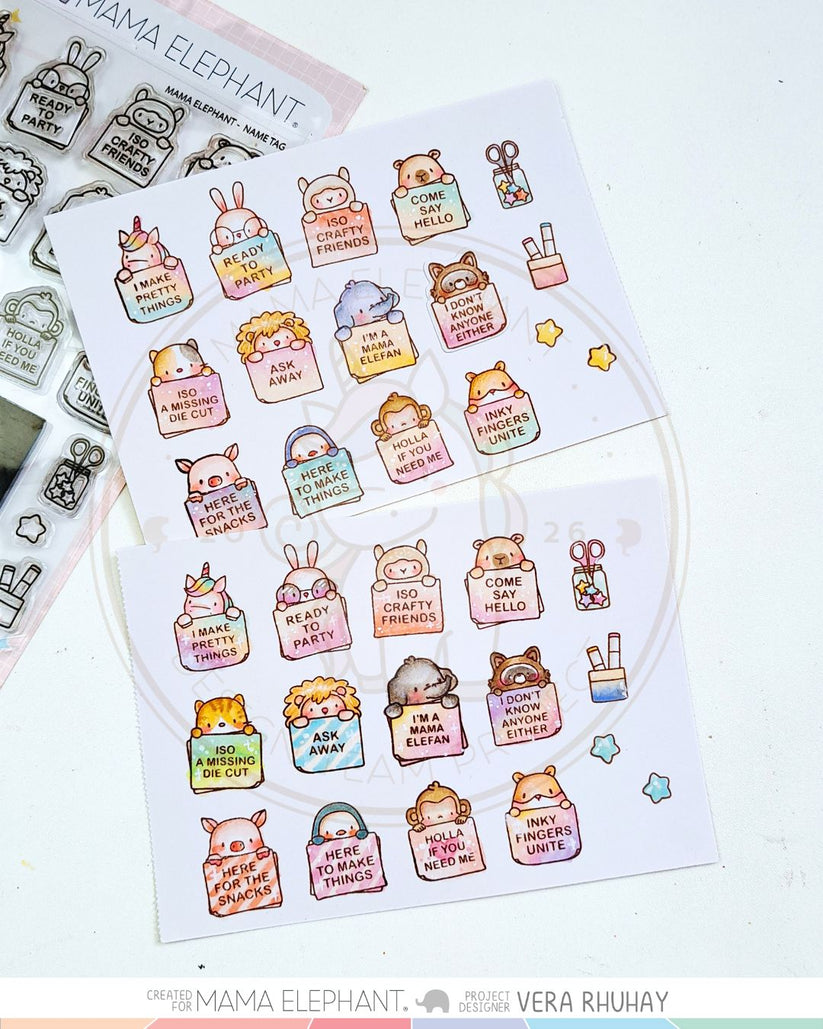 The centerpiece of this set is a classic "Hello My Name Is" name tag stamp, ready to be inked up in any color you choose for customization. But the fun doesn't stop there! This charming set also includes a series of Mama Elephant friends, each holding up their own little signs with the most relatable sentiments around — "ISO Crafty Friends" and "Inky Fingers Unite."
