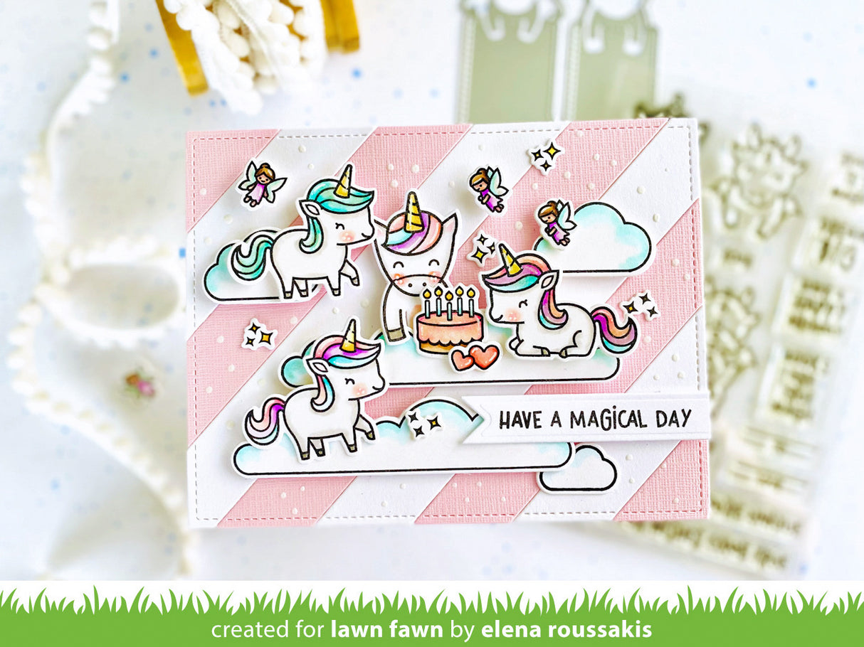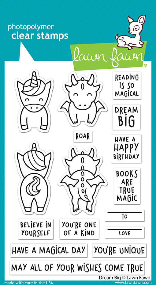 Make reading magical with this set of fantasy critters! The unicorn and dragon can hang on your cards or use them with the Dream Big Add-On to create gift tags and bookmarks! The encouraging sentiments are perfect for kids of all ages.