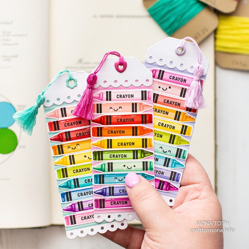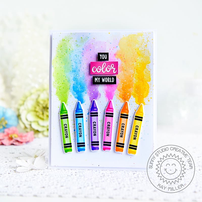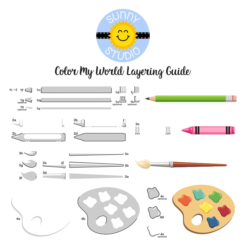 This set comes with everything you need to create three-dimensional crayons, pencils, paintbrushes, and paint palettes, along with one complimentary "You Color My World" sentiment.