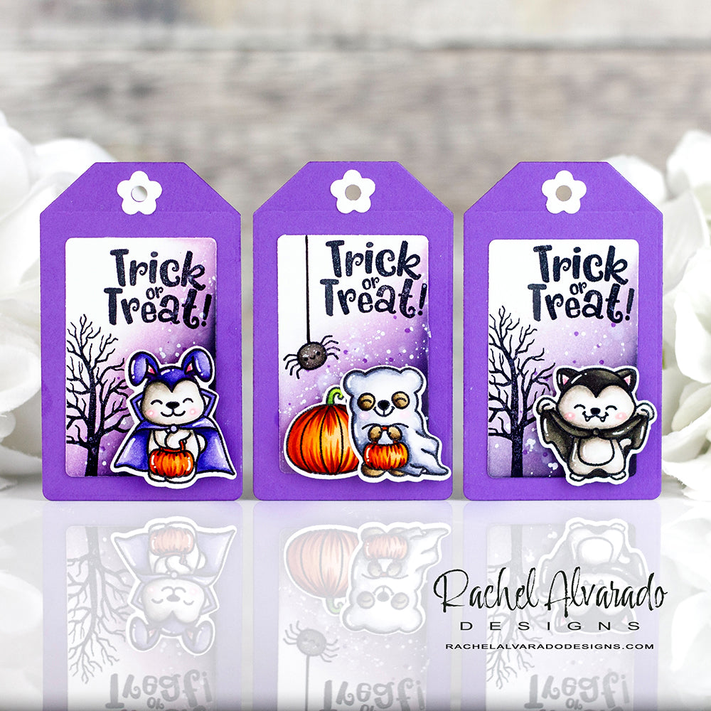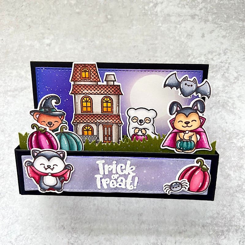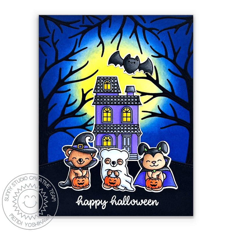 The stamp set includes 4 dressed up animals, three pumpkins, several jack o'lantern faces, a haunted manor, a spooky tree, a bat, spider, spider web, a number of stars and two whimsical Halloween greetings.